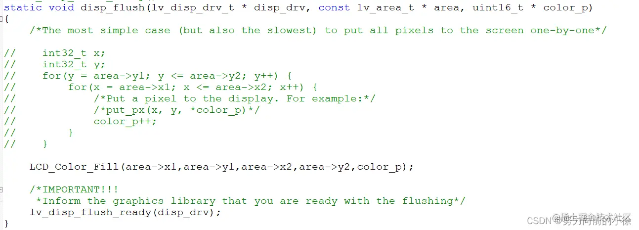 !!!PS:如果在移植的时候,自己使用的函数形参类型与lvgl的lv_color_t 不匹配的话,可以直接将该形参类型改为你需要的类型,也就是颜色深度的位数,但前提是lvgl的颜色深度得定义好。比如我使用的是16位颜色深度就直接将lv_color_t改成uint_16t,当然函数声明里面记得更改。