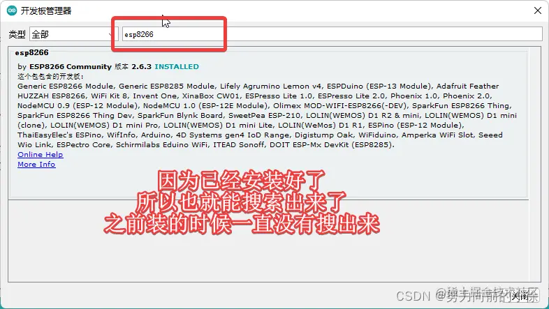 然后在开发板管理器界面搜索esp8266,运气好的话可能就搜索到了,反正我是从来没搜到过,下面介绍第二种安装方式