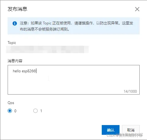#include <ESP8266WiFi.h> /* 依赖 PubSubClient 2.4.0 */ #include <PubSubClient.h> /* 连接您的WIFI SSID和密码 */ #define WIFI_SSID "WIFI名称" #define WIFI_PASSWD "WIFI密码" /* 线上环境域名和端口号 */ #define MQTT_SERVER "你的域名" #define MQTT_PORT 1883//端口号 #define MQTT_USRNAME "你的username" #define CLIENT_ID "你的clientId" #define MQTT_PASSWD "你的password" //发布消息用的topic #define PubTopic "你的topic" unsigned long lastMs = 0; WiFiClient espClient; PubSubClient client(espClient); //收到消息后的回调函数 void callback(char *topic, byte *payload, unsigned int length) { Serial.print("Message arrived ["); Serial.print(topic); Serial.print("] "); payload[length] = '\0'; Serial.println((char *)payload); } //wifi初始化 void wifiInit() { WiFi.mode(WIFI_STA); WiFi.begin(WIFI_SSID, WIFI_PASSWD); while (WiFi.status() != WL_CONNECTED) { delay(1000); Serial.println("WiFi not Connect"); } Serial.println("Connected to AP"); Serial.println("IP address: "); Serial.println(WiFi.localIP()); Serial.print("espClient ["); client.setServer(MQTT_SERVER, MQTT_PORT); /* 连接WiFi之后,连接MQTT服务器 */ client.setCallback(callback); } //发布一个字符串的消息 void pubMsg(char *msg) { boolean d = client.publish(PubTopic, msg); if(d){ Serial.println("publish success"); }else{ Serial.println("publish fail"); } } //发布指定长度的字符消息 void pubMsgLen(uint8_t *msg,int len) { boolean d = client.publish(PubTopic,msg,len); if(d){ Serial.println("publish success"); }else{ Serial.println("publish fail"); } } //连接到服务器 void mqttCheckConnect() { while (!client.connected()) { Serial.println("Connecting to MQTT Server ..."); if (client.connect(CLIENT_ID, MQTT_USRNAME, MQTT_PASSWD)) { Serial.println("MQTT Connected!"); } else { Serial.print("MQTT Connect err:"); Serial.println(client.state()); delay(5000); } } } void setup() { /* initialize serial for debugging */ Serial.begin(115200); //开启串口 Serial.println("Demo Start"); wifiInit();//连接wifi unsigned char i=0; mqttCheckConnect();//连接阿里云 pubMsg("hello aliyun!"); } // the loop function runs over and over again forever void loop() { client.loop();//保持客户端的连接 }
