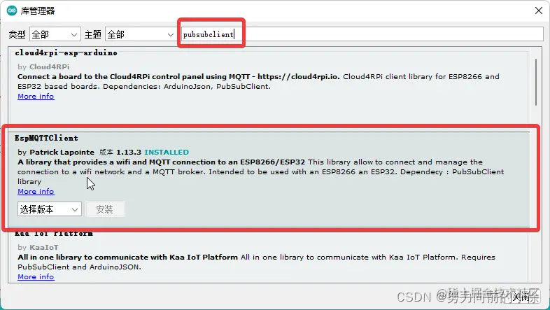 搜索pubsubclient,然后安装如下所示的包,版本自己选择