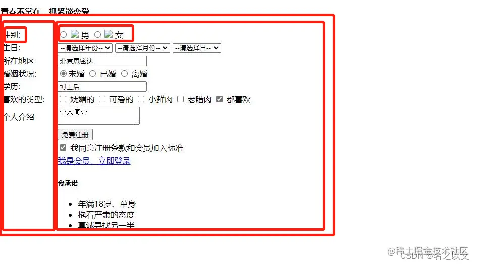 添加label标签的原因是为了扩大点击的范围,原本我们是只有点击小圆圈才能有效,再添加label属性后,我们点击“男”这个字,同样能达到点中小圆圈的作用