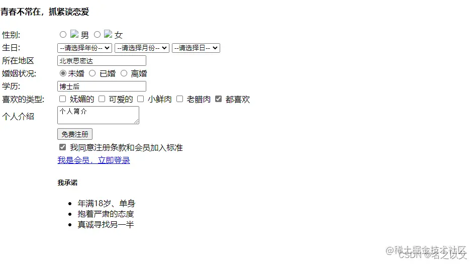 情况与性别栏类似;只是多了个checked属性,表示为默认选中项