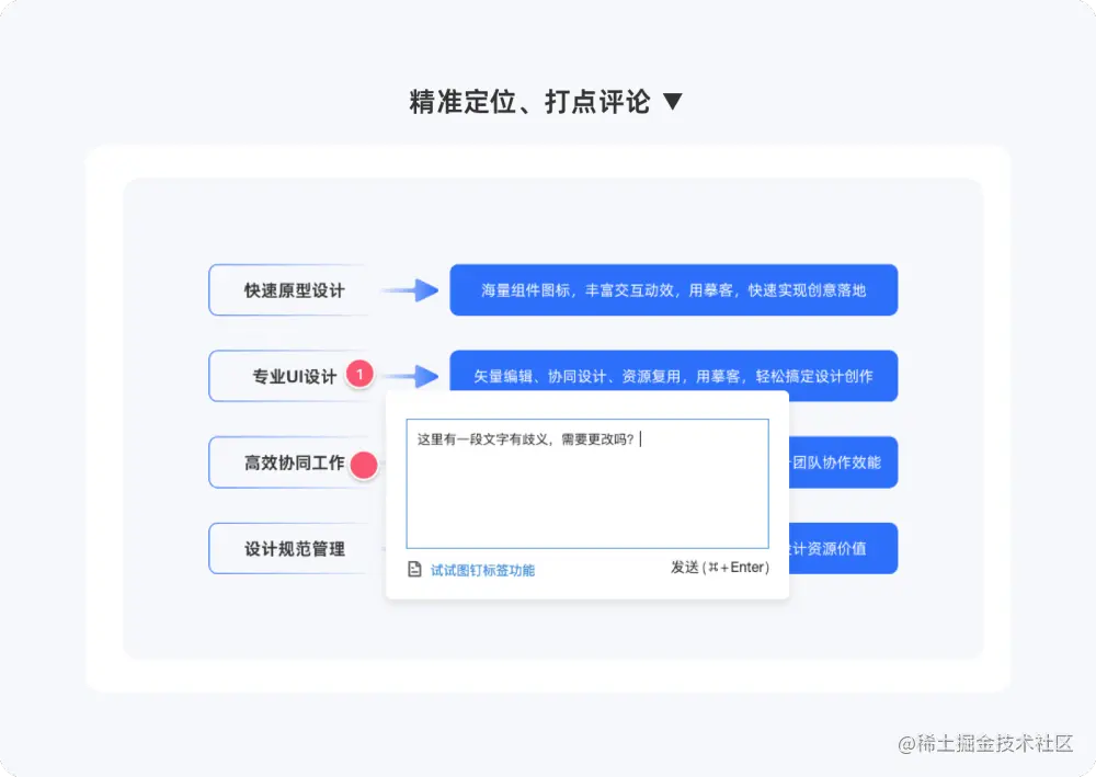 团队各成员可对设计稿的问题和建议定位打点评论,再次上传相同的设计稿,之前的不会被删除/覆盖,会自动生成历史版本,方便进行前后对比,快速分辨版本差异。