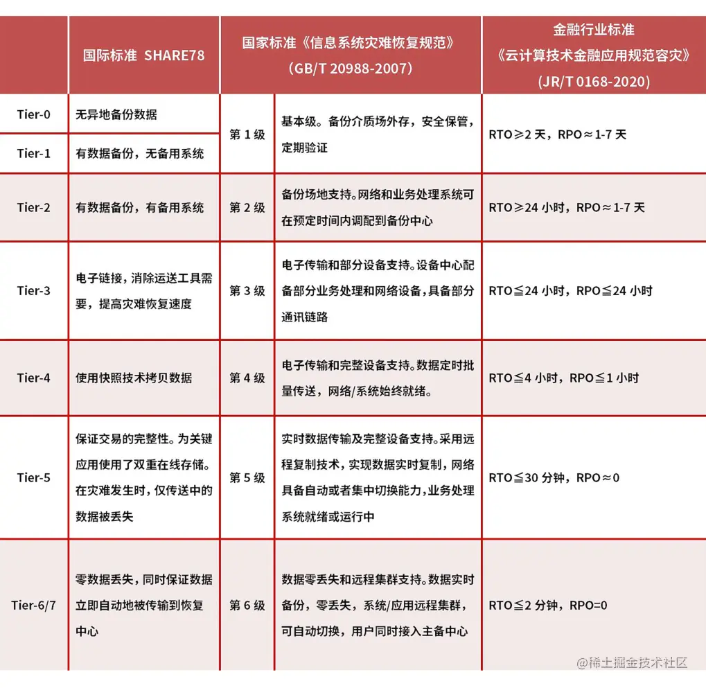 2020年10月16日,中国人民银行正式发布《云计算技术金融应用规范 容灾》(JR/T 0168-2020)作为金融行业标准,要求应用于金融领域的云计算平台应至少达到容灾能力 3 级要求,并明确了对应的 RTO、RPO、可用性等关键指标。