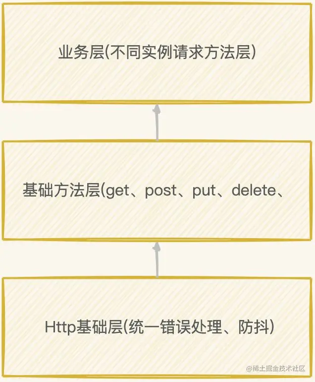 Http工具由三部分组成:Http基础层、基础方法层、业务层。Http基础层提供一个统一处理错误和防抖的axios实例;基础方法层提供了一些基础方法,支撑业务层;业务层通过传入不同的axios示例,构建不同的业务请求方法。
