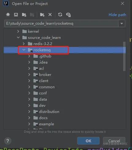 按照maven的方式open RocketMQ目录,因为笔者已经open过了,所以不会出现maven的提示,如果读者的出现了,点击trust project即可,然后就等待下载对应的依赖即可
