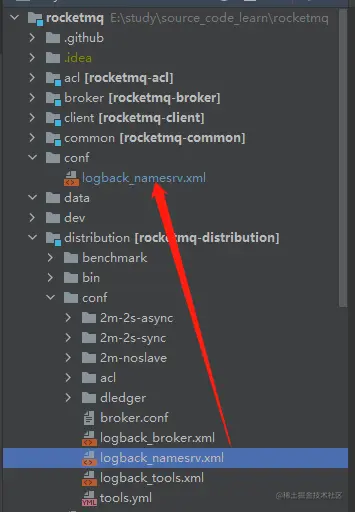 读者可能会疑惑,我怎么知道Namesrv的日志配置是怎么样的,这些问题RocketMQ都已经给我们想好了,在RocketMQ源码目录下,有一个distribution的目录,下面有不同模式部署RocketMQ对应的配置文件,目前我们本地跑,暂时只需要使用外面最基础的配置文件就可