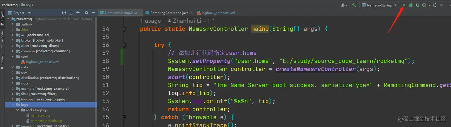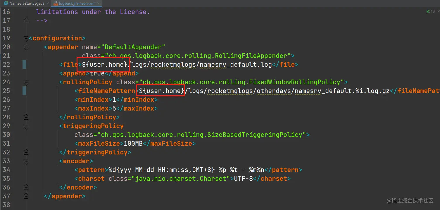 我们想把RocketMQ运行产生的日志指定放在我们之前准备好的logs目录下的话,放任不管肯定是不行,当然读者也可以选择直接将${user.home}直接全量替换成我们日志目录的绝对路径,不过在这里,笔者喜欢用另一种方式,通过增加一句代码的方式来实现。