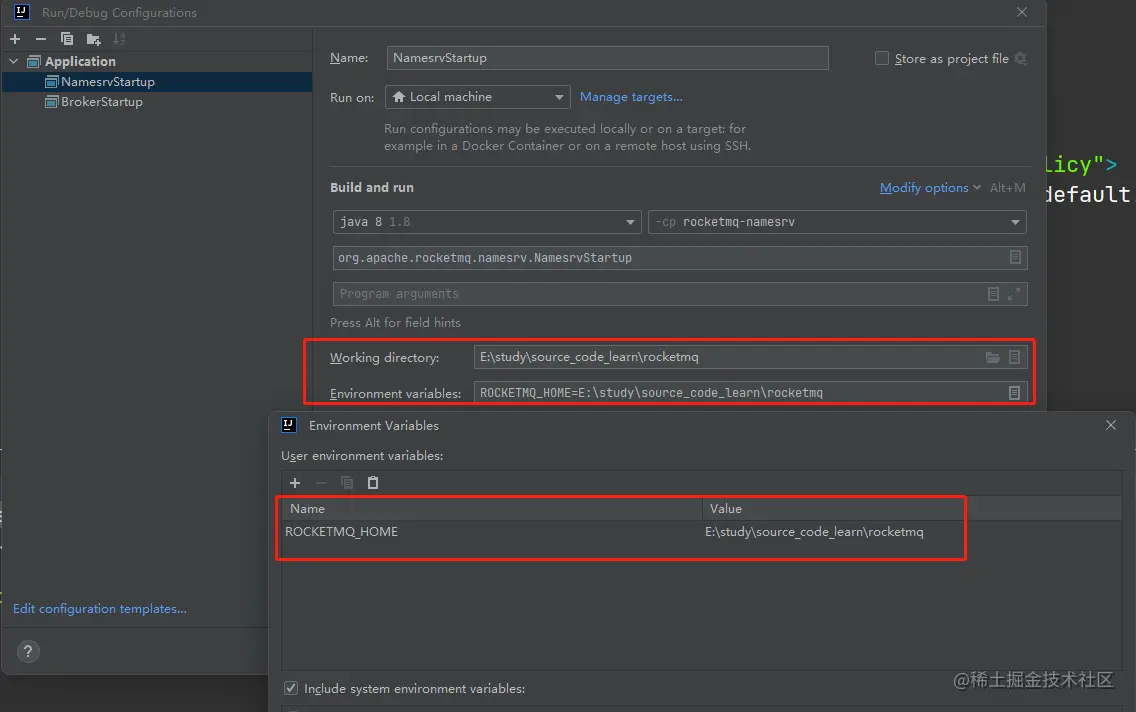 我们需要配置对应的环境变量,让RocketMQ启动的时候,把我们当前的源码目录作为根目录,这样它才能找到运行所需的配置文件在哪