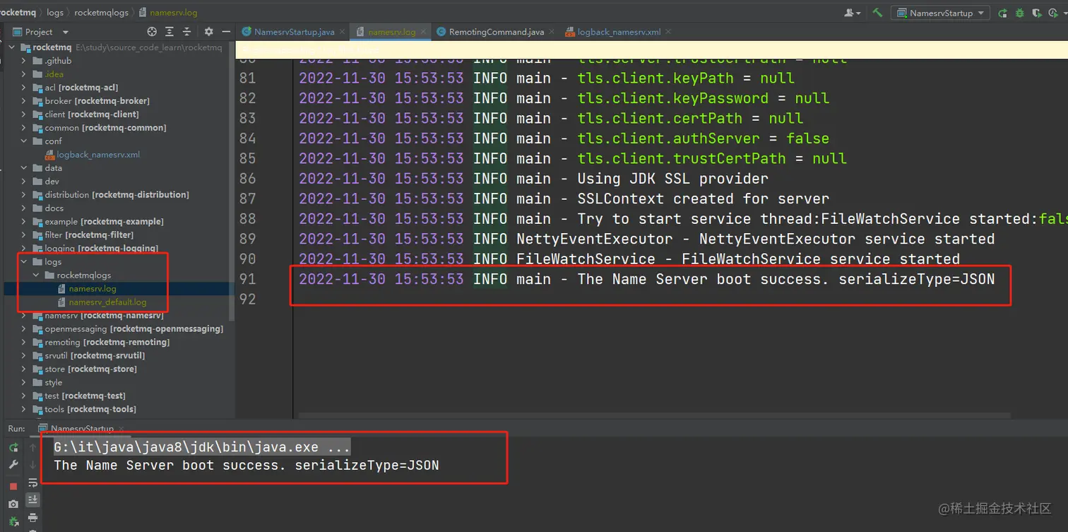 通过上面一系列的操作,我们终于把我们的Namesrv给启动起来了,这样子我们就能够在我们本地去调试Namesrv启动的整个过程,可以看一下都进行了什么操作,内部使用了什么数据结构,保存了什么元数据。还是那句,想要深入研究任何一个技术框架,在自己本地搭建一个源码调试环境是必不可少的。