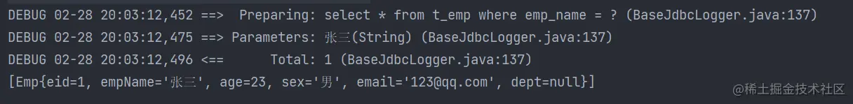 List<Emp> emps = mapper.getEmpByChoose(new Emp(null, "张三", 23, "男", "123@qq.com", null));