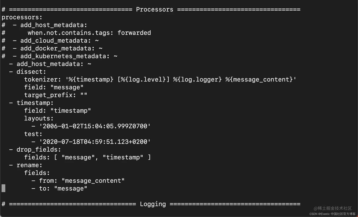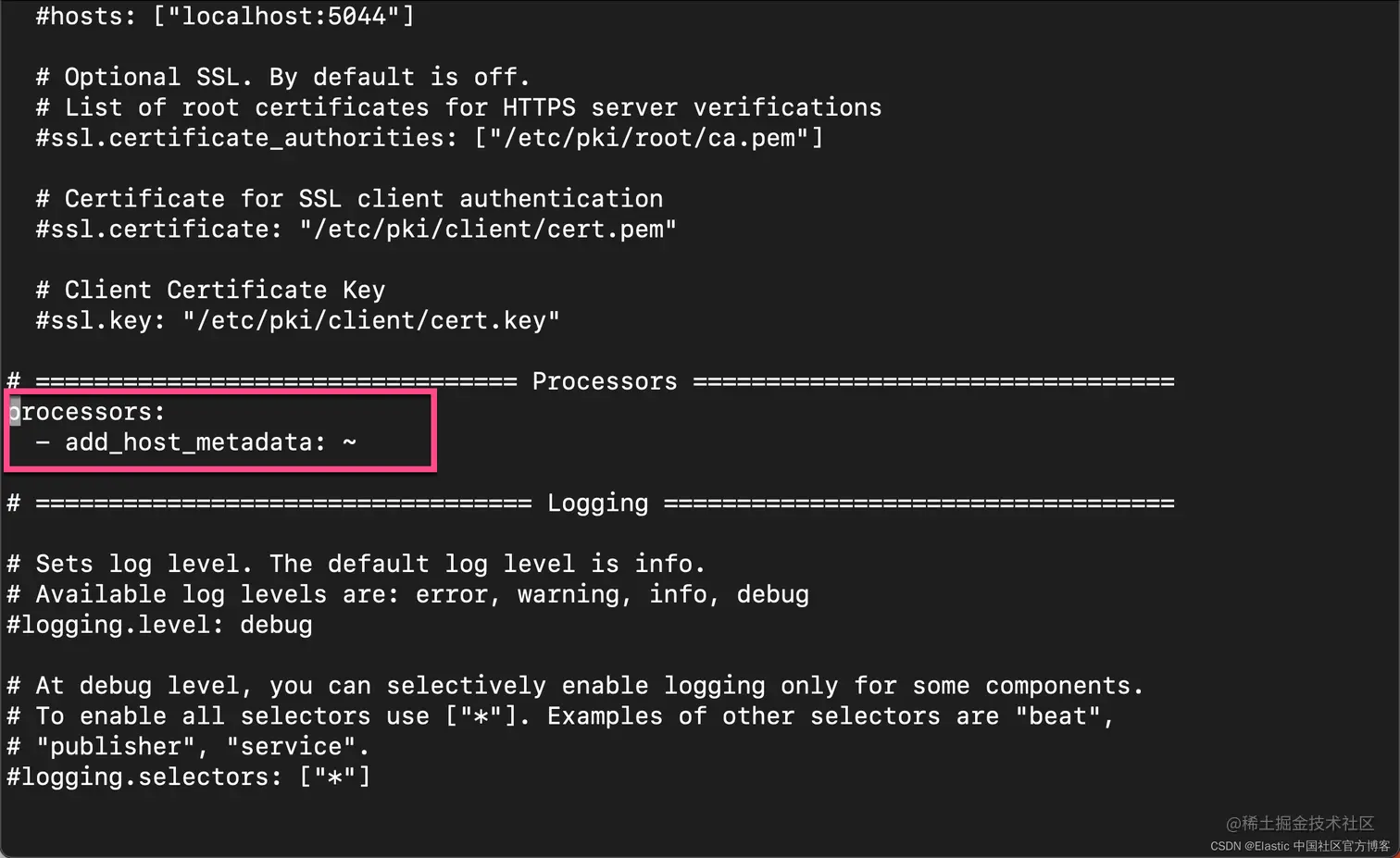2)现在,进入 Filebeat 配置。 首先,让我们删除除 add_host_metadata 处理器之外的所有处理器,以添加一些主机信息,如主机名和操作系统。
