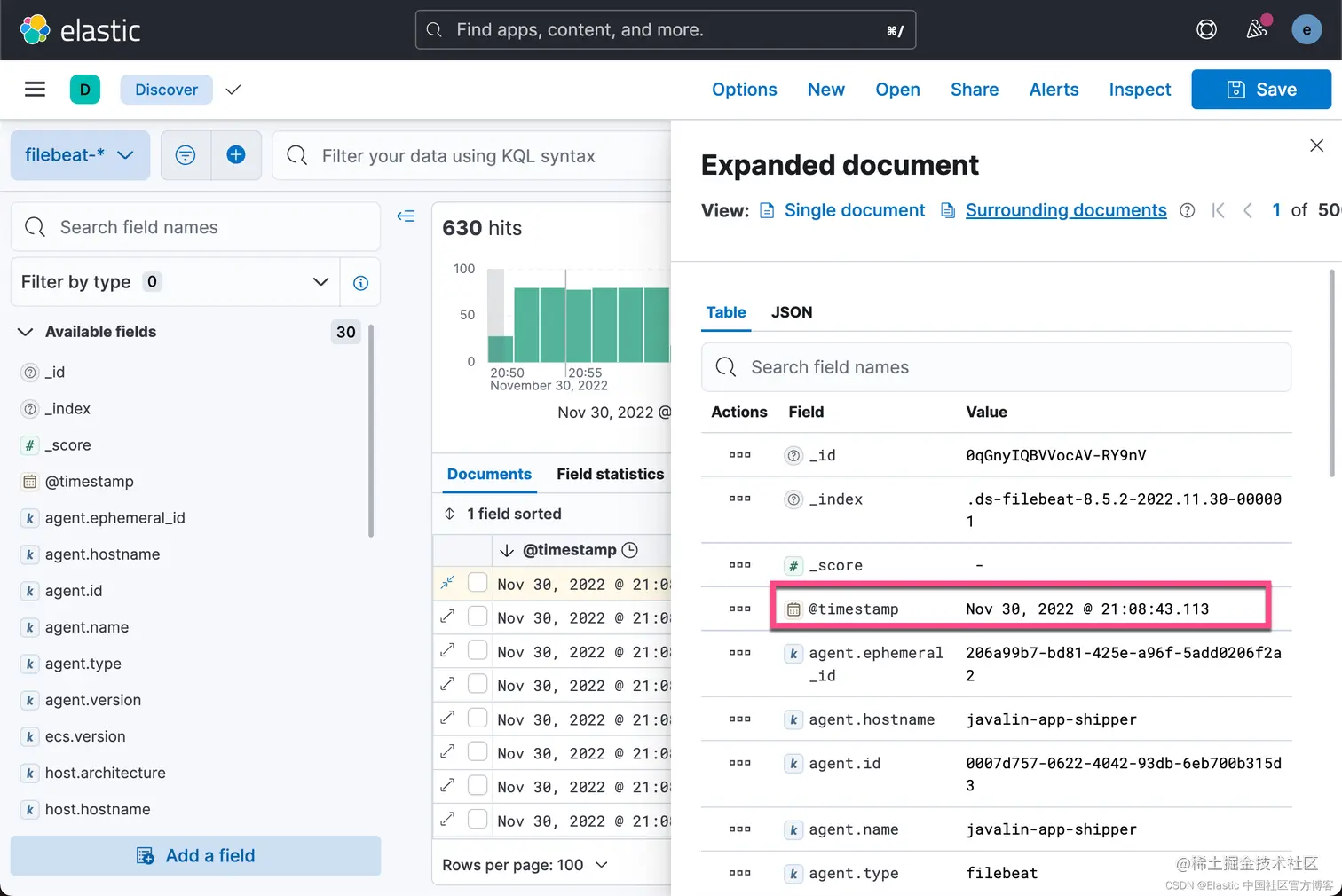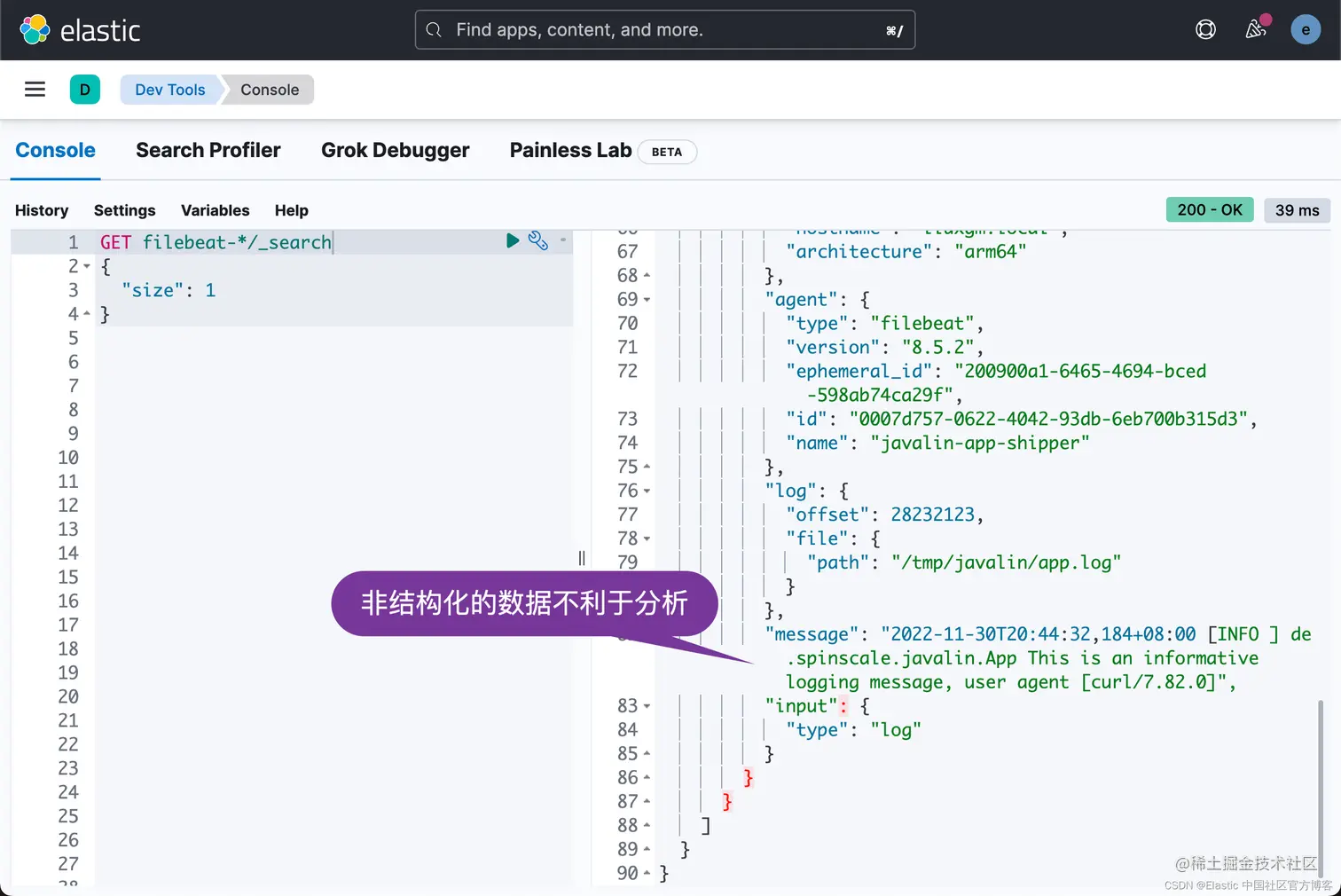 你可以在输出中看到管道创建的字段,现在看起来像早期的 Filebeat 处理器。 由于摄取管道在文档级别工作,你仍然需要检查生成日志的异常情况,并让 Filebeat 从中创建一条消息。 你甚至可以使用单个处理器实现 log level 的 trim,并且日期解析也非常简单,因为 Elasticsearch ISO8601 解析器在拆分秒和毫秒时正确识别逗号而不是点。