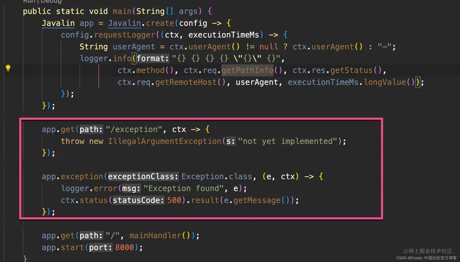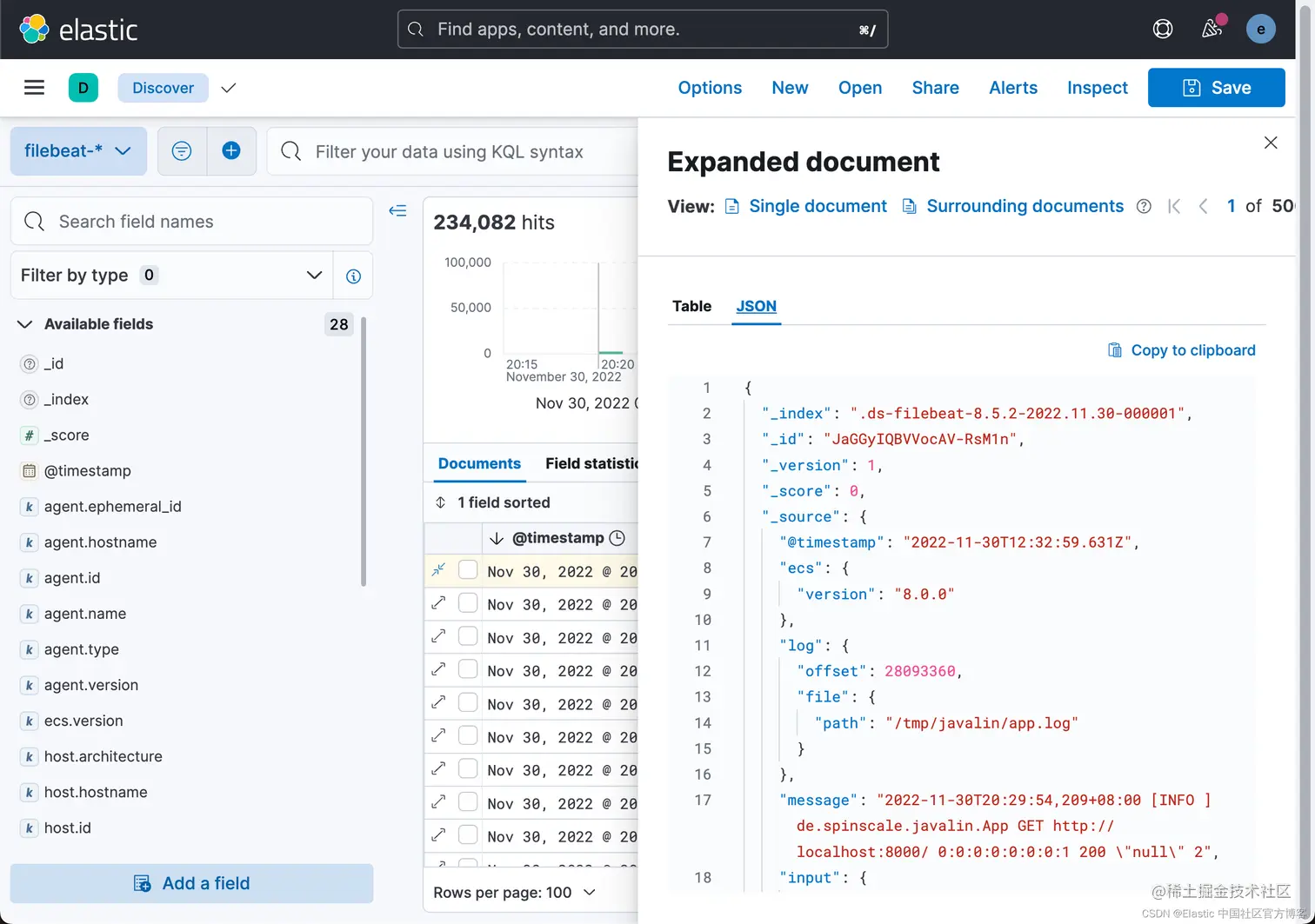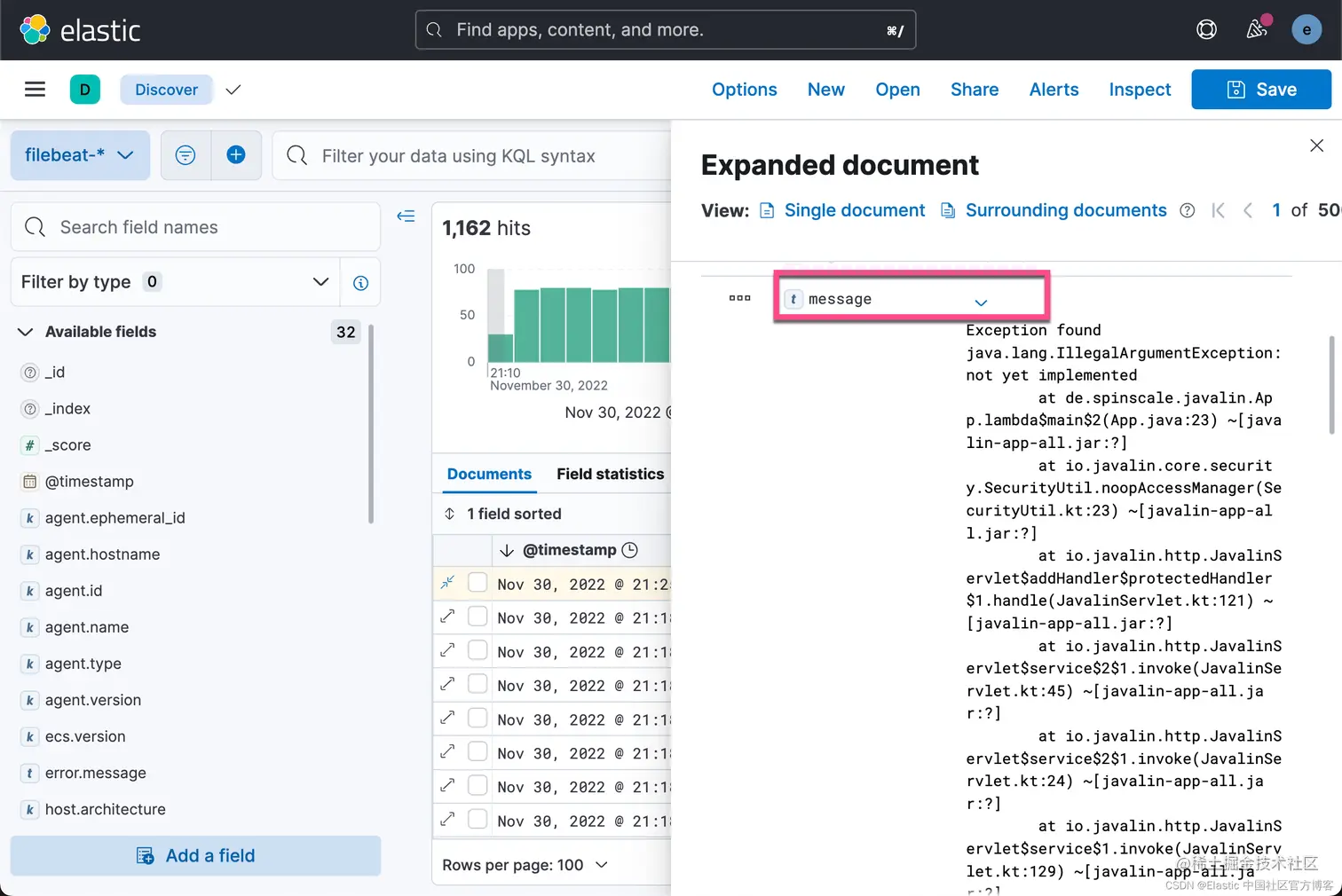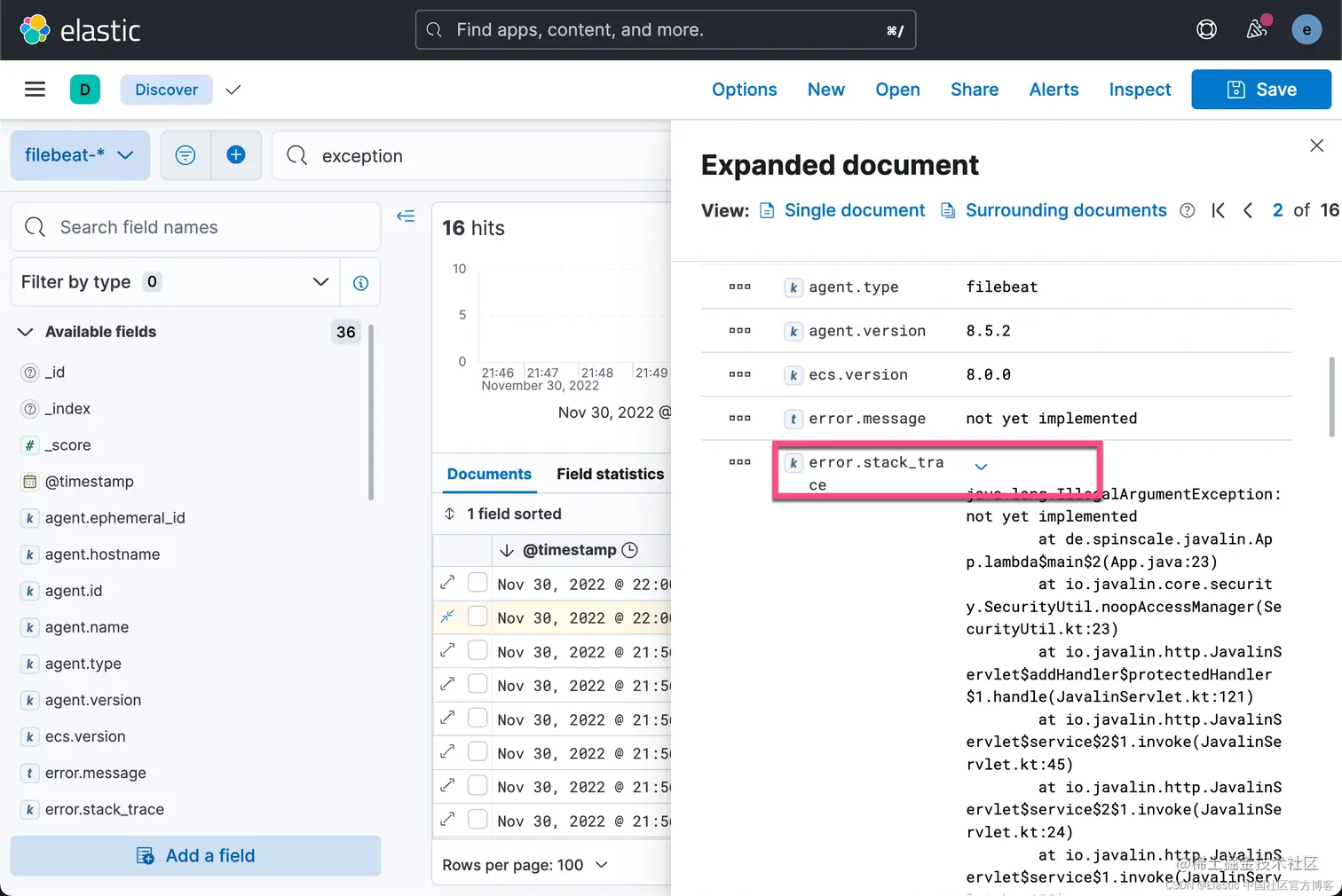 重新启动 Filebeat 和你的 Javalin 应用程序后,触发异常,你将在日志的消息字段中看到一个长堆栈跟踪。