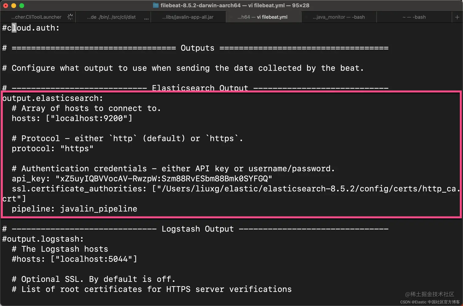 3)编辑 Elasticsearch 输出以确保在从 Filebeat 为文档编制索引时将引用管道。