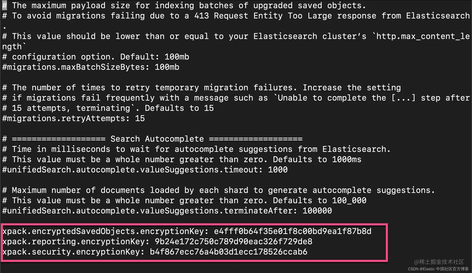 我们把上面的三个 keys 拷贝并粘贴到 config/kibana.yml 文件的最后面: