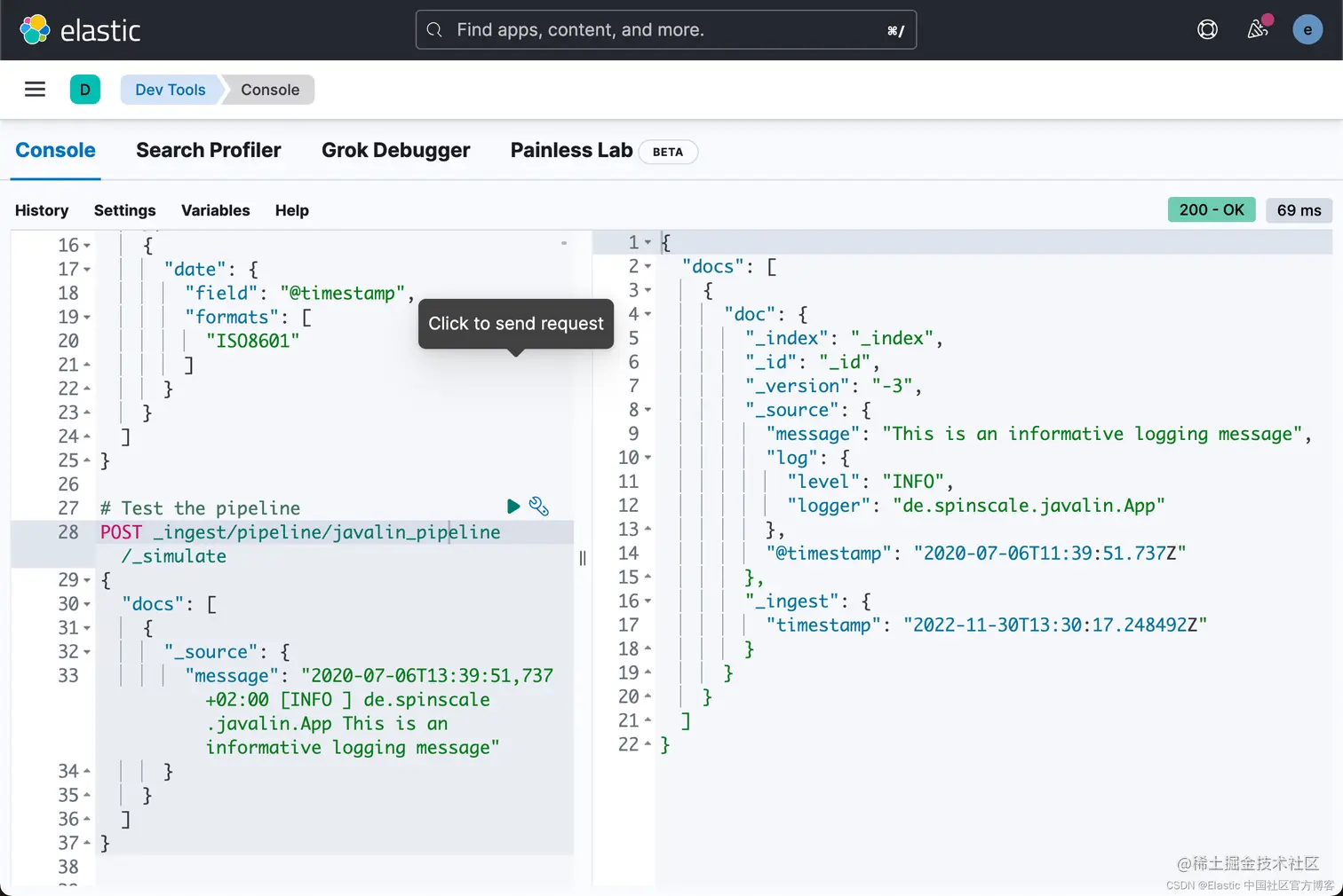 1)让我们使用 Kibana 中的 Dev Tools 面板编写一个类似于我们的 Filebeat 处理器的管道,运行以下命令: