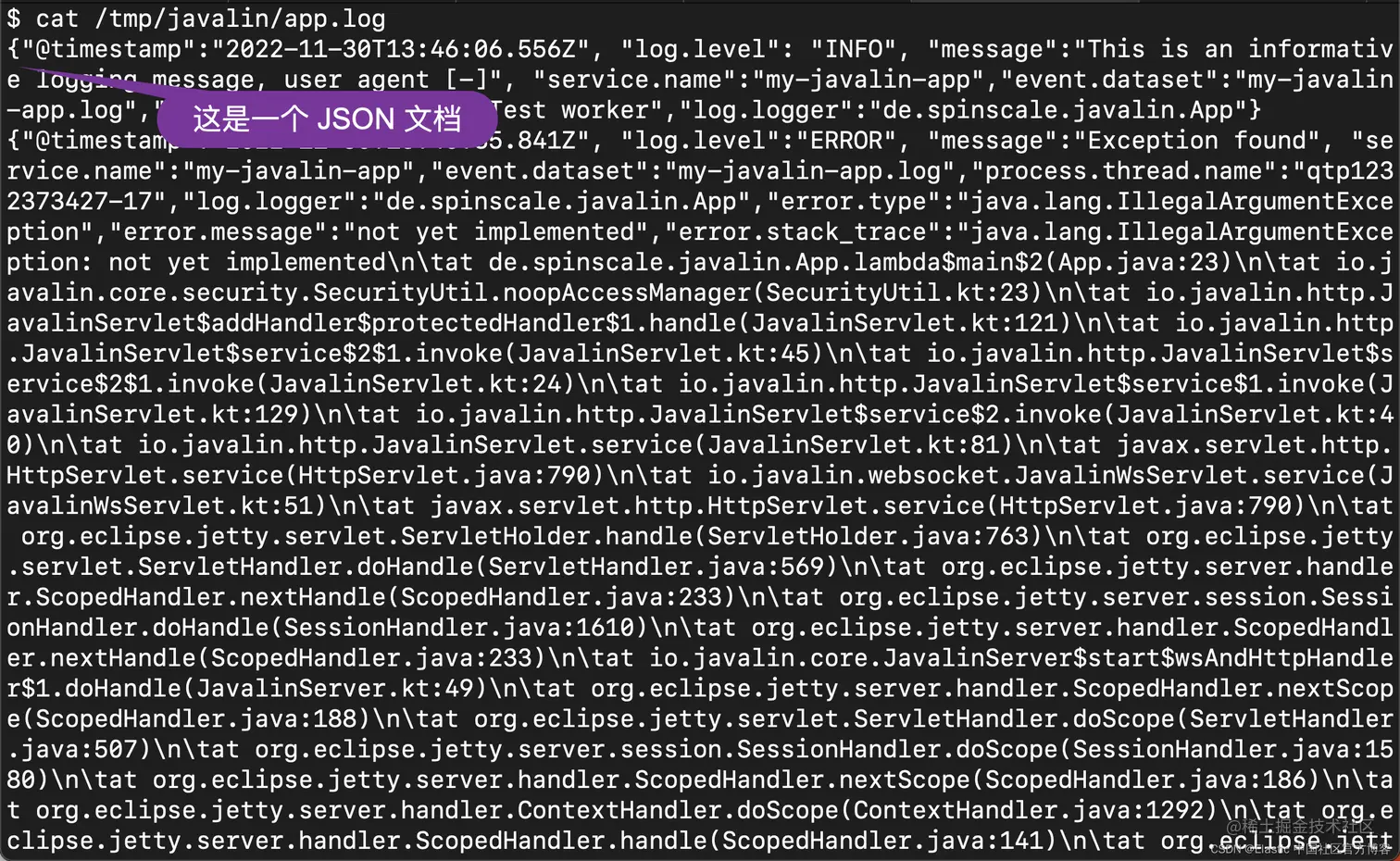 当你重新启动你的应用程序时,你将看到纯 JSON 写入您的日志文件。 当你触发异常时,你会看到堆栈跟踪已经在你的单个文档中。 这意味着 Filebeat 配置可以变得无状态甚至更轻量级。 另外,Elasticsearch 端的 ingest pipeline 可以再次删除。