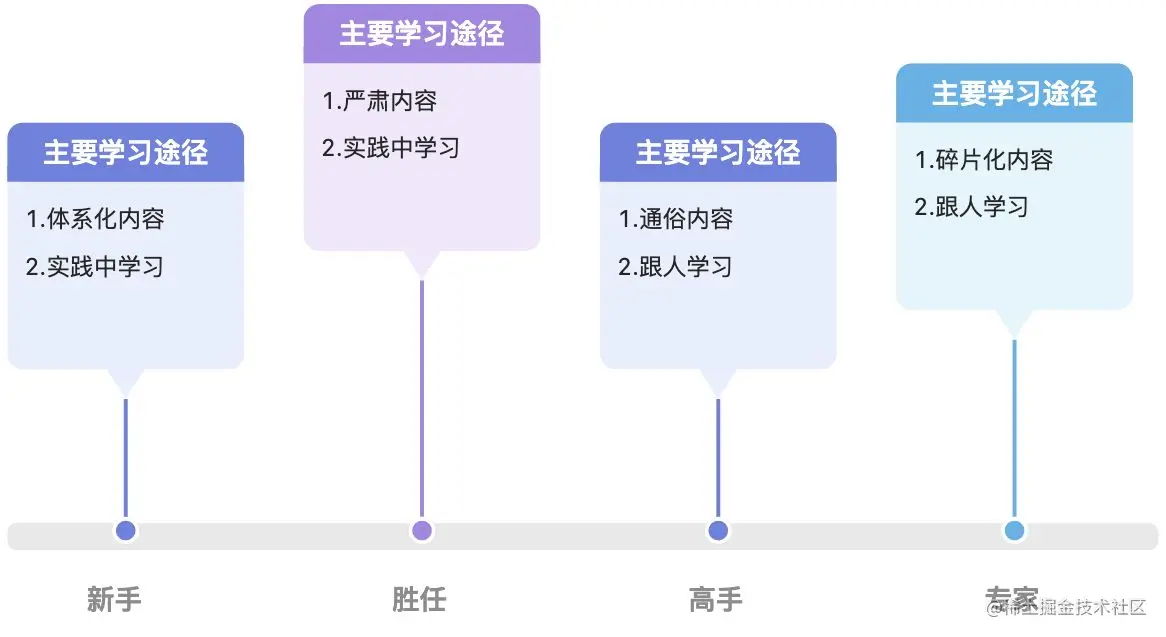 其实每个阶段的人学习途径重点也应该是不一样的,下面图中给你列出了每个阶段应该关注的学习途径。
