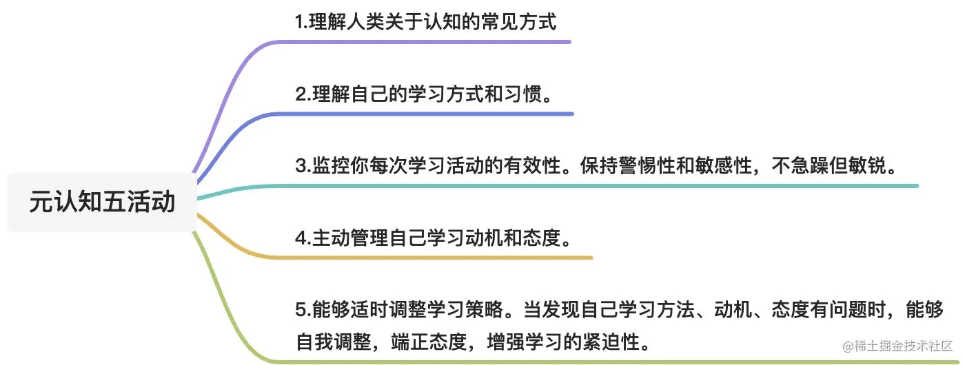 元认知是指对于认知策略的监控、评估与调整。通俗的说,对于你完成某个学习任务知道该用哪些合理的方法,并能够根据学习任务即时调整和选择相应的方法,在懈怠的时候能够主动去完成任务。背单词和古诗与学习物理定律的方式方法是不一样的,你不能拿着学物理的方式来学习历史。对于我们来说,需要掌握大量关于认知的知识,即完成不同学习任务的流程、方法、注意事项、常规犯错等等。元认知大概包括如下五个活动