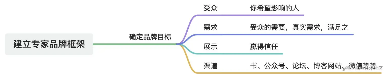 现代社会,有很多品牌产品,他们存在的意义其实是降低人们选择的成本,因为品牌会让人信赖,放心。个人品牌也是如此,我们找工作也是让别人信赖、放心的过程。那么我们如何建立自己的专家品牌呢?作者给我们列了一个专家品牌建立框架,如下: