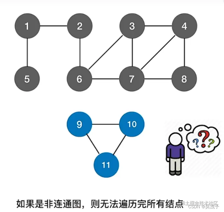 与广度优先算法一样,如果存在非连通图,那么同样的,我们可以直接从0号结点开始,遍历所有结点查看是否有未被访问的结点,找到第一个值为false的结点。从这个结点出发调用BFS。