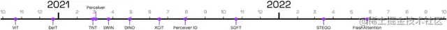 图 1:各类Vision Transformer模型的推出时间(此处以论文在arXiv平台上的发表时间为准)