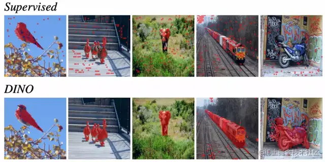 图9:标准视觉主干网络无监督训练得到的分割图(上)DINO无监督训练得到的分割图(下)