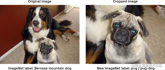 图6:来自ImageNet数据集的示例图像(左),对其进行裁剪会产生不同的标签(右)