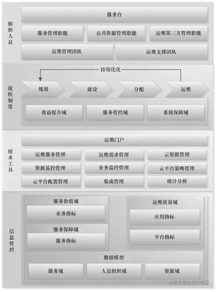 从信息管控、技术工具、流程制度、组织人员四个域来描述云运维管理体系,如图2所示,具体介绍如下。