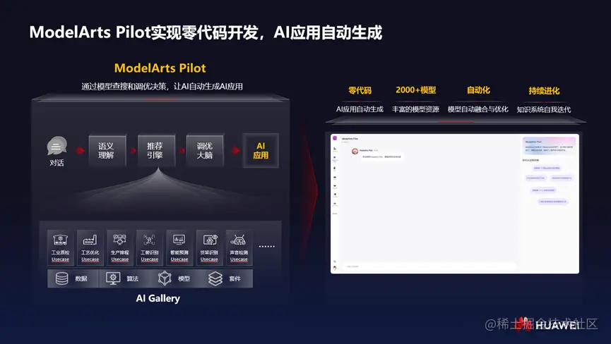 - **在AI资产重用方面,AI开发助手ModelArts Pilot可以实现AI行业应用零代码开发。**随着AI资产库越来越丰富,甚至面向整个业务问题的解决方案都可以通过AI资产库获得。基于此背景,一种基于AI资产重用的AI开发新范式:ModelArts AI开发助手ModelArts Pilot发布了。