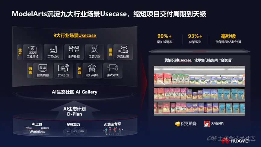 - **在加速AI的行业落地方面,AI Gallery沉淀了9大行业场景Usecase供开发者调用。**包括出行调度、销量预测、生产排程、货架识别、工业质检等,覆盖生产、销售、服务、运营等企业运作全场景。开发者和伙伴,可以在AI Gallery上学习AI、开发AI、分享AI资产,基于AI Usecase进行商业实践。