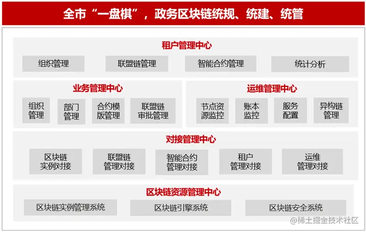 **应用层:**面向业务部门,构建开放的区块链+政务服务的开发平台,实现开放的区块链+政务服务应用生态,满足各业务部门政务服务效能提升的需求。