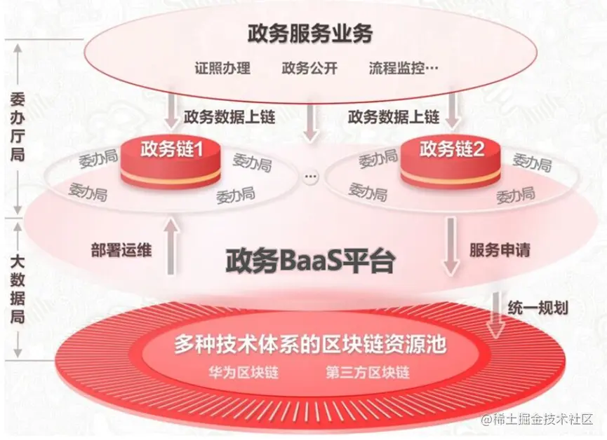 **政务链:**基于统一的区块链政务BaaS平台,面向大数据局和各业务部门创建独立的租户空间,业务部门可按需创建政务链。