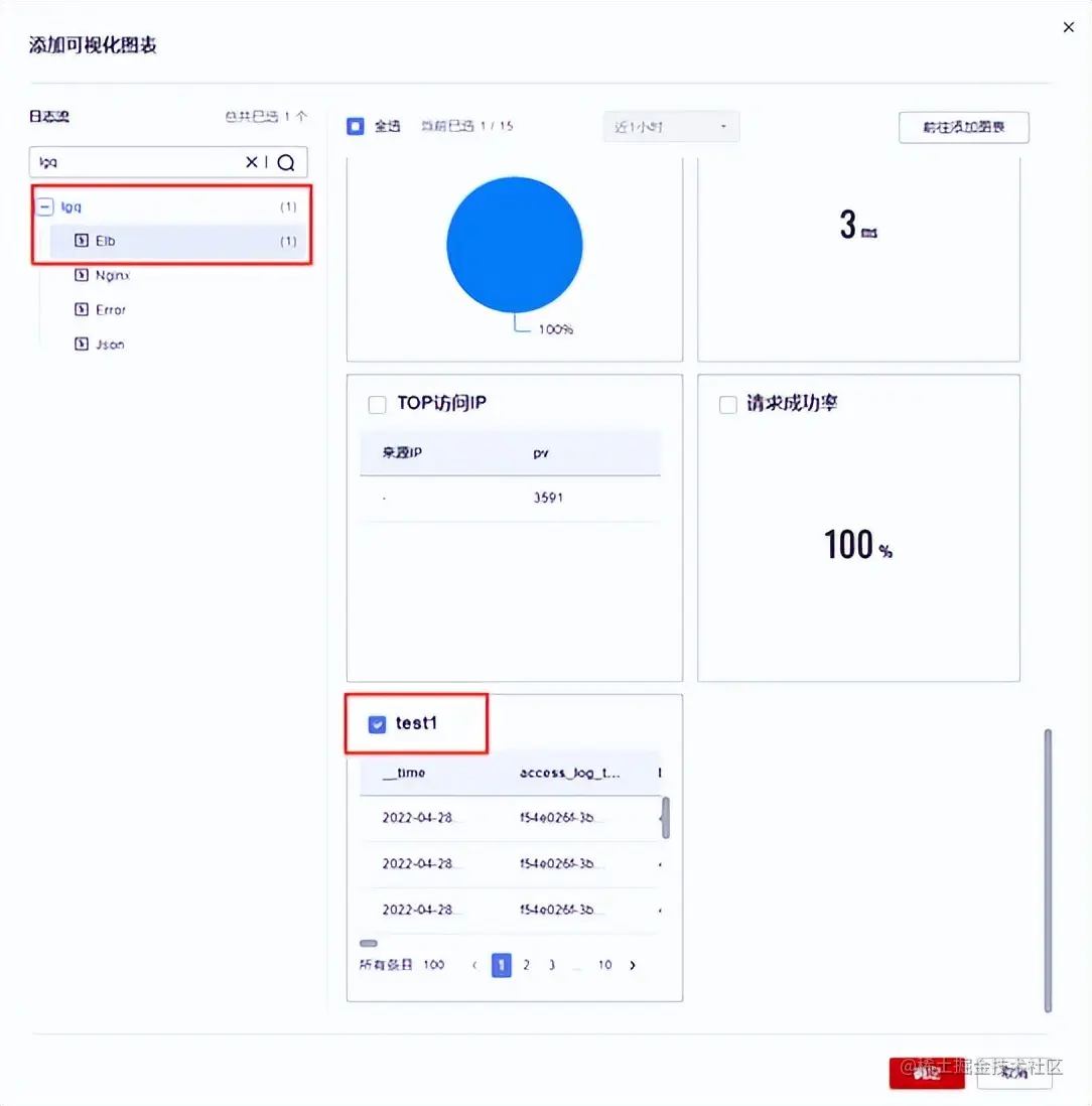 单击“开始添加图表”,进入添加可视化图表界面,选择目标日志新建的可视化图表。