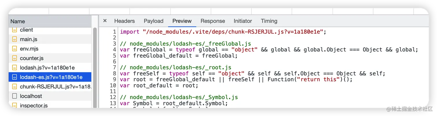 这是没有进行依赖预构建的浏览器请求,可以看到浏览器发起了非常多的请求。