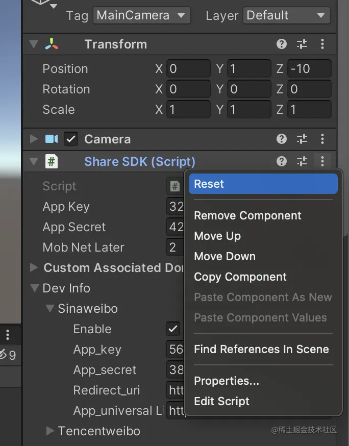 确定文件里修改了AppKey等信息之后,要去挂载脚本那边同步看下AppKey是否修改,可以点击Reset,刷新,同步下修改后的信息,也可以自己直接在挂载脚本里面改,最后要确定脚本文件里和挂载脚本里都已经改为了自己的信息