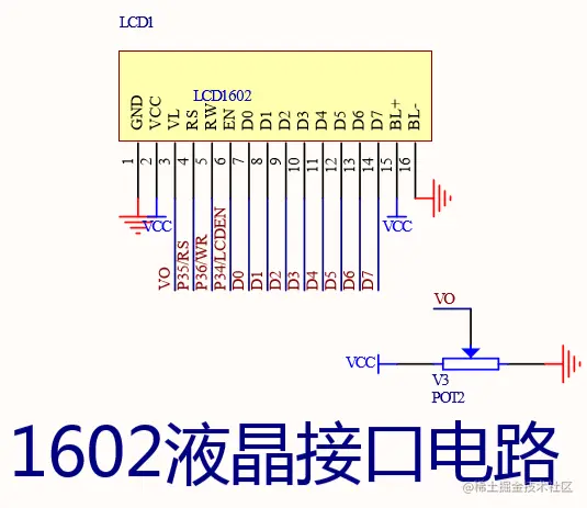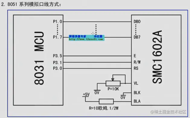 D0~D7数据口接了P0口,6接口是使能端,接了P3.4。然后5这个IO口和我们的不一样,因为这里只写,所以视频中直接接了低电平,4是数据命令选择端,接了P3.5,3是偏压信号,接地,液晶显示需要负电压,并用滑动变阻器调节,电压就会变化,内部对比度就会变化。
