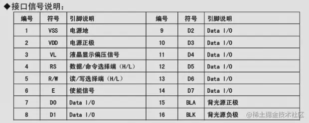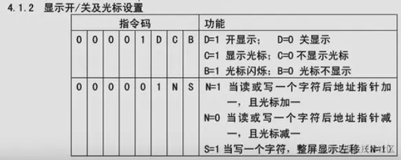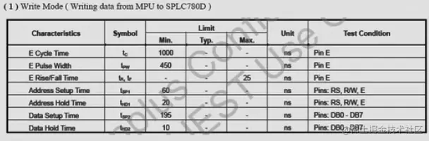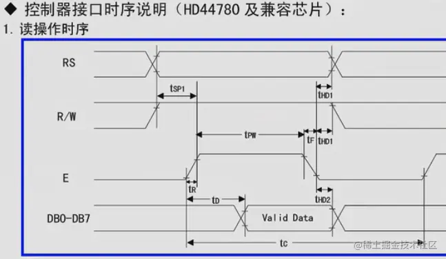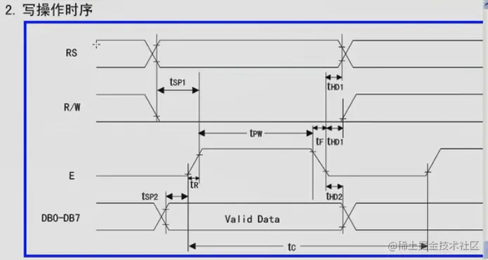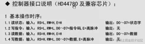 我们只看写,1.2:RS=L(选中了命令,命令就是指令),RW=L(写),D0~D7指令码(后面讲,D0~D7可以送指令也可以送数据,由RS决定),E=高脉冲前者为高脉冲,后者为低脉冲。输出就不管了。