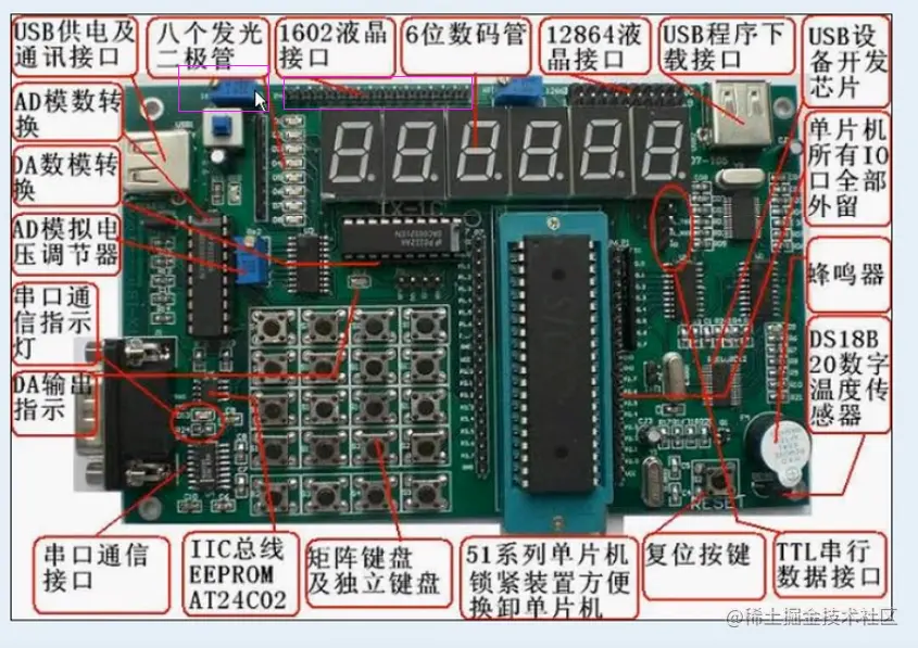 右边那个用于插入1602,左边那个电位器(滑动变阻器)用于调节液晶的对比度,转动后,字符的颜色会发生深浅变化。