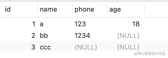 最后第三条记录,第三条记录 phone 列 和 age 列是 NULL 值,所以,对于第三条数据,NULL 值列表用十六进制表示是 0x06。