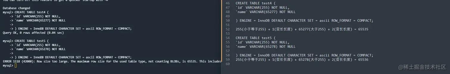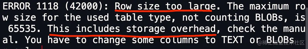 从报错信息就可以知道一行数据的最大字节数是 65535(不包含 TEXT、BLOBs 这种大对象类型),其中包含了 storage overhead。