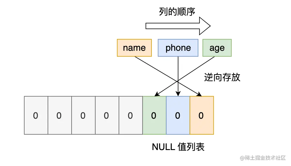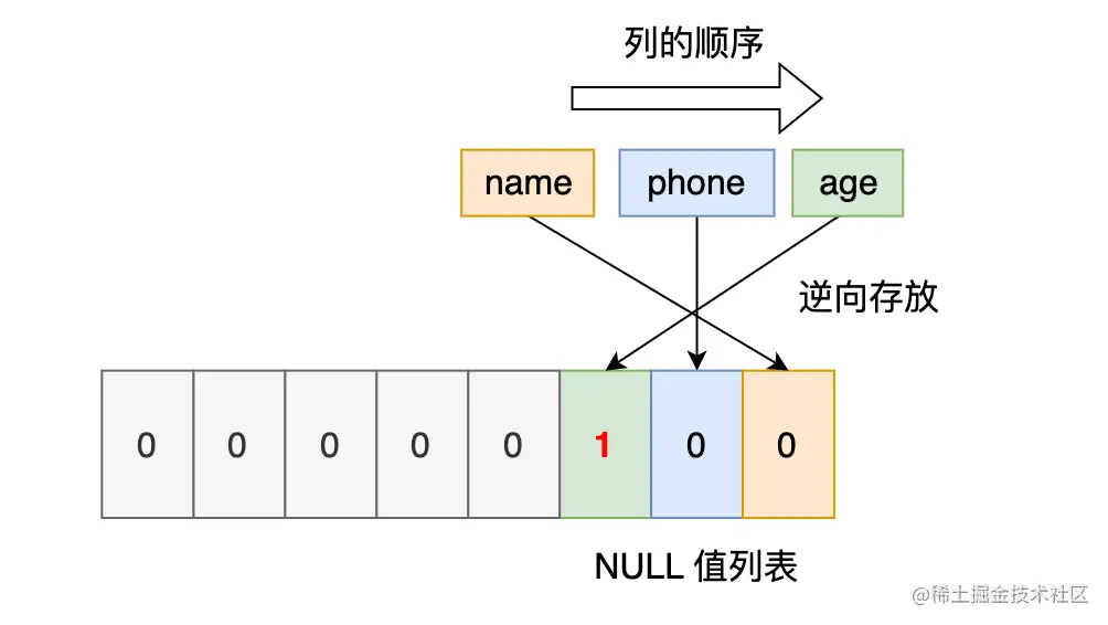 同样的道理, NULL 值列表的信息也需要逆序存放。