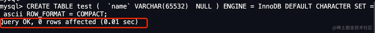 可以看到,创建成功了。说明我们的推论是正确的,在算 varchar(n) 中 n 最大值时,需要减去 「变长字段长度列表」和 「NULL 值列表」所占用的字节数的。