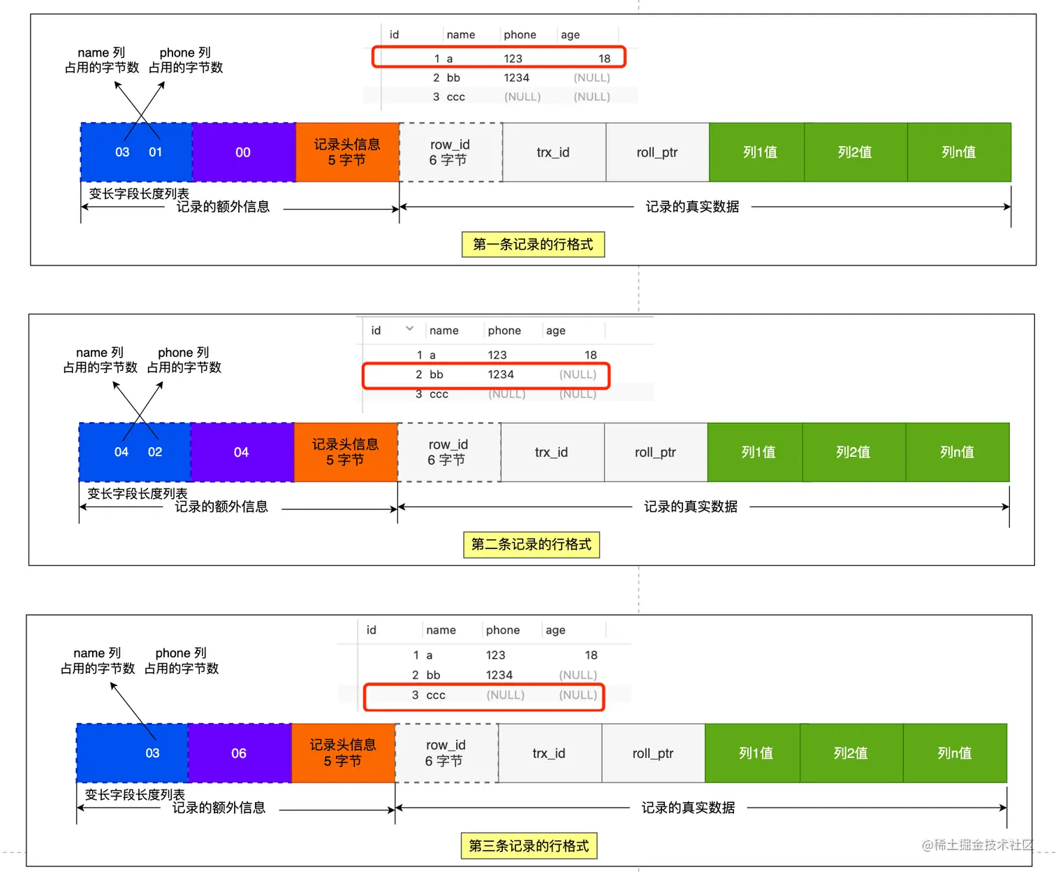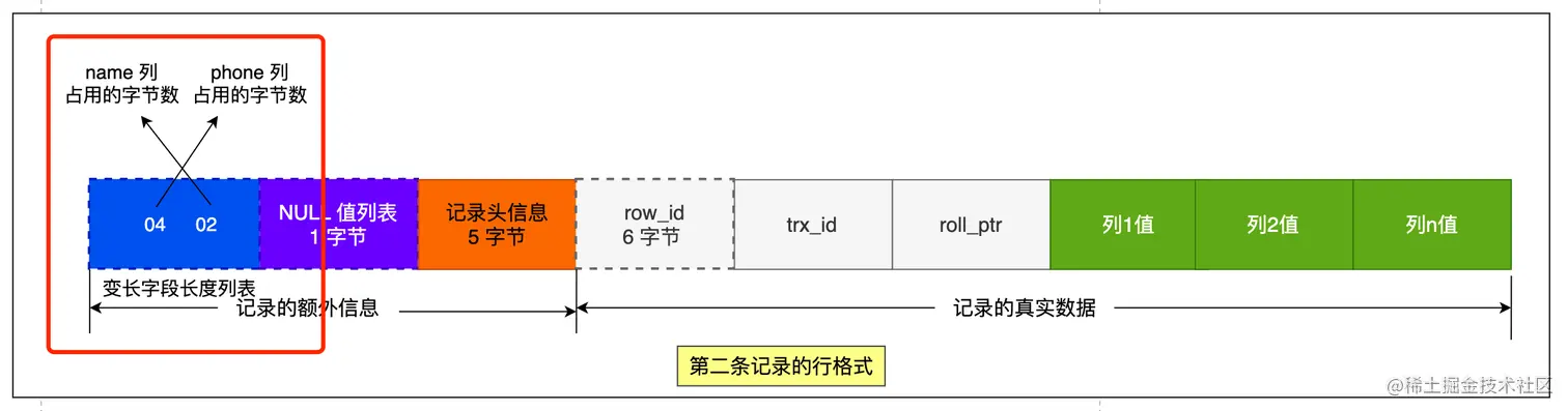 第三条记录中 phone 列的值是 NULL,NULL 是不会存放在行格式中记录的真实数据部分里的,所以「变长字段长度列表」里不需要保存值为 NULL 的变长字段的长度。