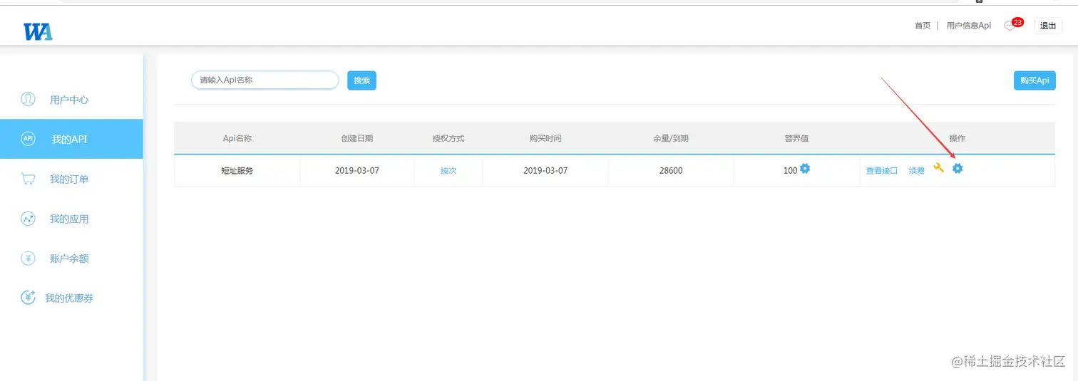 1、登录会员中心=>我的API=>找到短址服务=>操作栏内的查看与设置按钮: