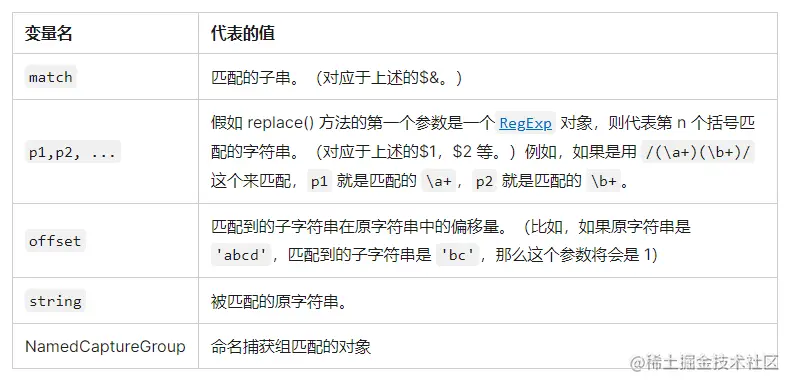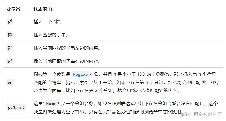 其实,第二个参数作为字符串还有一些高阶的用法,就是字符序列,在作为字符串的第二个参数中,$符号开头的某些特殊字符会被替换成其它字符,MDN上的表格是这样: