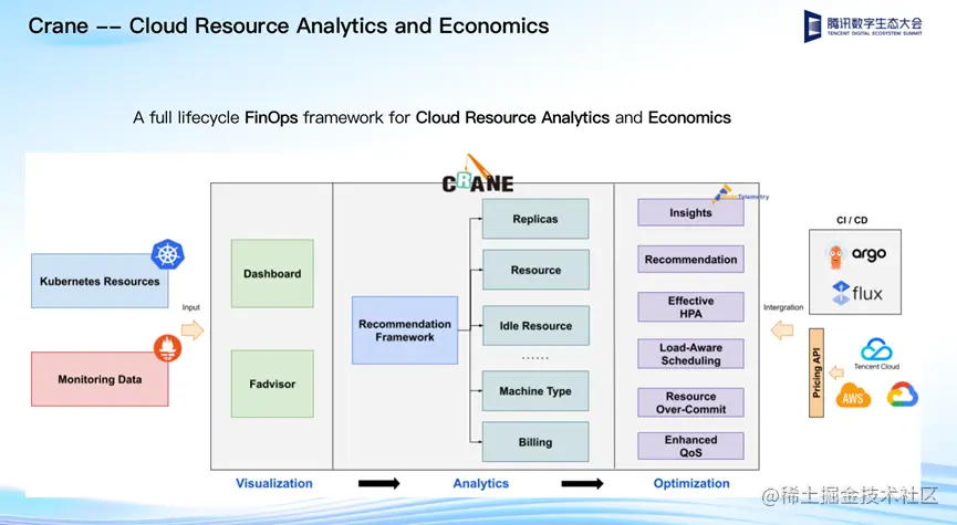 Crane就是受FinOps理念而来的开源项目,“它是一个FinOps的平台,对云资源进行分析和成本优化,目标是能够极致的降低成本,同时保证应用的质量不受影响。”通过成本观测、成本分析、成本优化的三个阶段,用户可以观测到成本的使用、分配,并在自动化的推荐下优化资源,解决成本的浪费的问题。