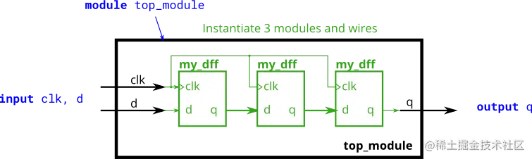 问题: 实例化三个my_dff,然后将它们连接在一起,构成长度为3的移位寄存器。注意:clk端口需要连接到所有的寄存器实例上
