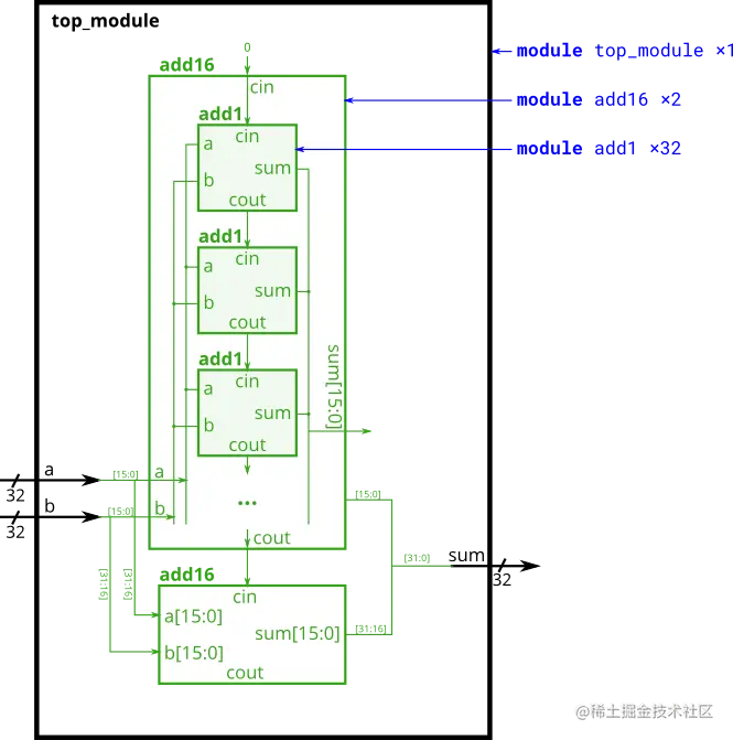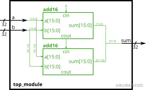 问题: 给出了一个可以做16bit加法的模块add16,实例化两个add16以达到32bit加法的。一个add16模块计算结果的低16位,另一个add16模块在接收到第一个的进位后计算结果的高16位。此32bit加法器不需要处理输入进位(假设为0)和输出进位(无需进位),但为了内部模块为了结果的正确仍要处理进位信号。(换句话说,add16模块执行16bit的a+b+cin,而顶层模块执行32bit的a+b)